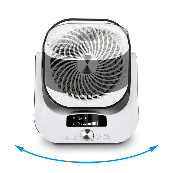 The Soleus Air 9" Tabletop Digital Display Air Circulator with Remote Control is a powerful air moving machine. The large digital display shows ambient temperature, speed settings, modes, and timer. The 3D-spin feature and 12-speed DC motor gets air moving exactly where it is needed most. A 7.5 hour timer can be easily set to turn the air circulator off in half-hour increments. Activate sleep mode to gradually reduce the speed settings as you sleep, for a more restful night. Natural wind mode will mimic natures breeze with gusts and calms of air movement. Eco Mode uses the ambient temperature on the digital display to keep air moving most when it is hot and least when the temperature is around 70 degrees. The ultra-quiet operation moves air as low as 30 dB. This air circulator works great with other Soleus Air products to boost airflow and maximize the benefits of air conditioning, heating, dehumidification, and air purification.