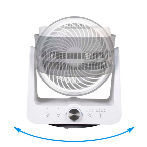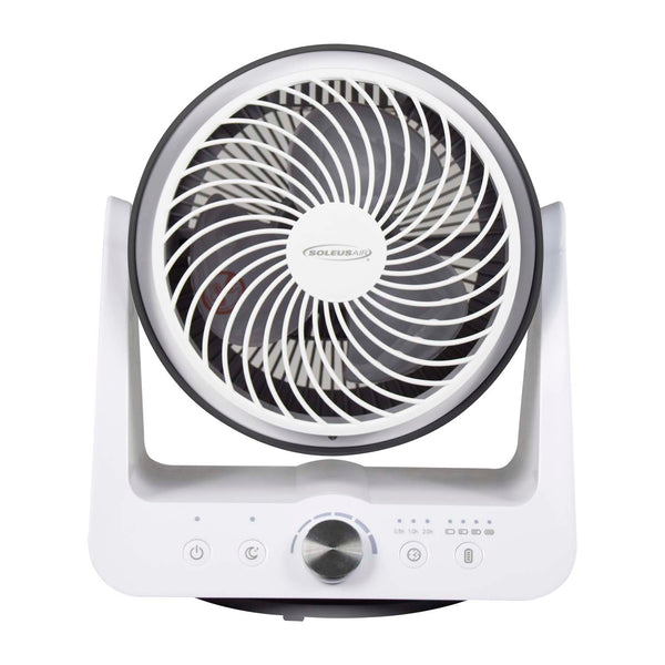 The Soleus Air 9" Tabletop Rechargeable Air Circulator is a powerful air moving machine. The portable design with 90-degree pivot, adjustable head and 6-speed DC motor gets air moving exactly where it is needed most. A 3.5 hour timer can be easily set to turn the air circulator off in half-hour increments. Activate sleep mode to gradually reduce the speed settings as you sleep, for a more restful night. Operate the air circulator up to 4 hours on a single charge or keep plugged in for continuous operation. The ultra-quiet operation moves air as low as 30 dB. This air circulator works great with other Soleus Air products to boost airflow and maximize the benefits of air conditioning, heating, dehumidification, and air purification.